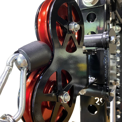 Anodized Red Aluminum Pulley: The anodized red aluminum pulley assembly includes an aircraft-grade smooth cables system allowing no jerky movements or catching while using either upper or lower stations.
