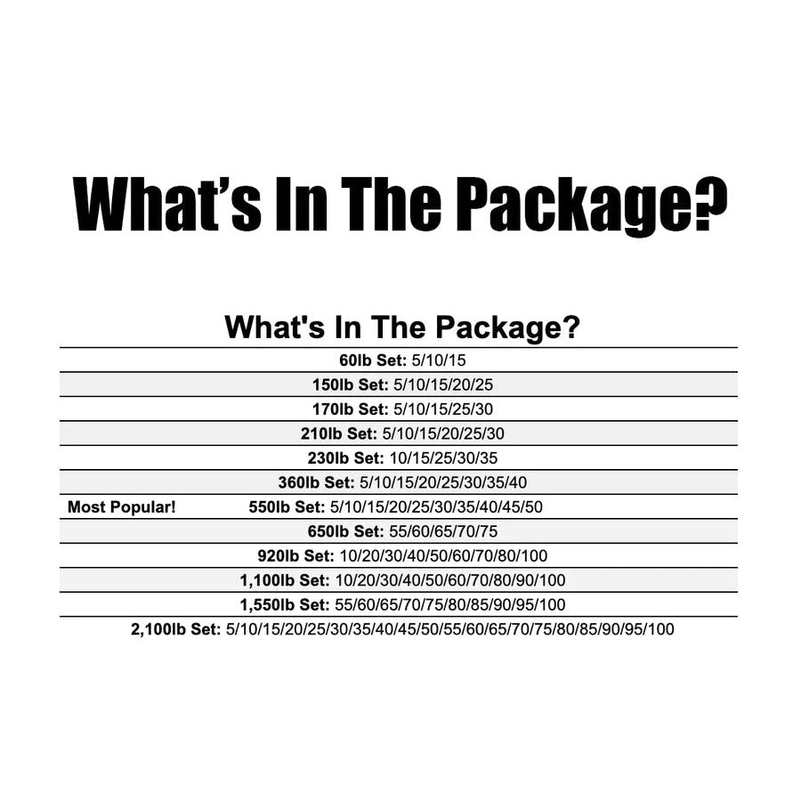 Dumbbells in 5-50lb Set: 2x5lb / 2x10lb / 2x15lb / 2x20lb / 2x25b / 2x30lb / 2x35lb / 2x40lb / 2x45lb / 2x50lb = 550lbs Total