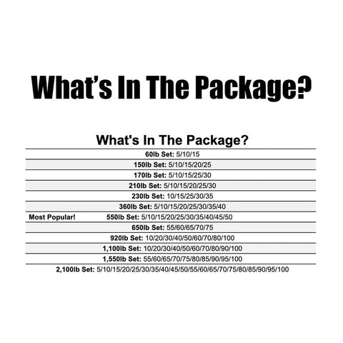 - 3lb, 5lb, 8lb, 10lb, 12lb, 15lb, 17.5lb, 20lb, 22.5lb, 25lb, 27.5lb, 30-100 (5lb increments)