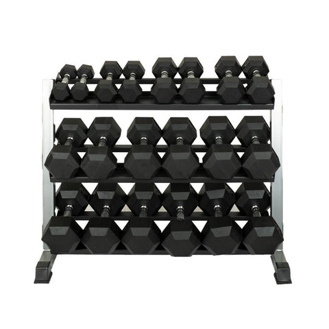 Warrior 3-Tier Dumbbell Rack (5-50lb Set): Ensure your exercise space remains tidy, orderly, and most importantly, safe, with the Warrior 3-Tier Dumbbell Rack. Warrior's 10-Pair Dumbbell rack is versatile, fitting snugly against walls or standing boldly in the center of a room. Crafted for strength and space efficiency, the Warrior 3-Tier Dumbbell Rack boasts heavy-gauge steel and welded construction on all sides, all meticulously deburred inside and out for user protection. The Warrior 3-Tier Dumbbell Rack holds a 5-50lb dumbbell set, or one pair each of 5-50lb hex dumbbells, totaling up to 9 pairs.